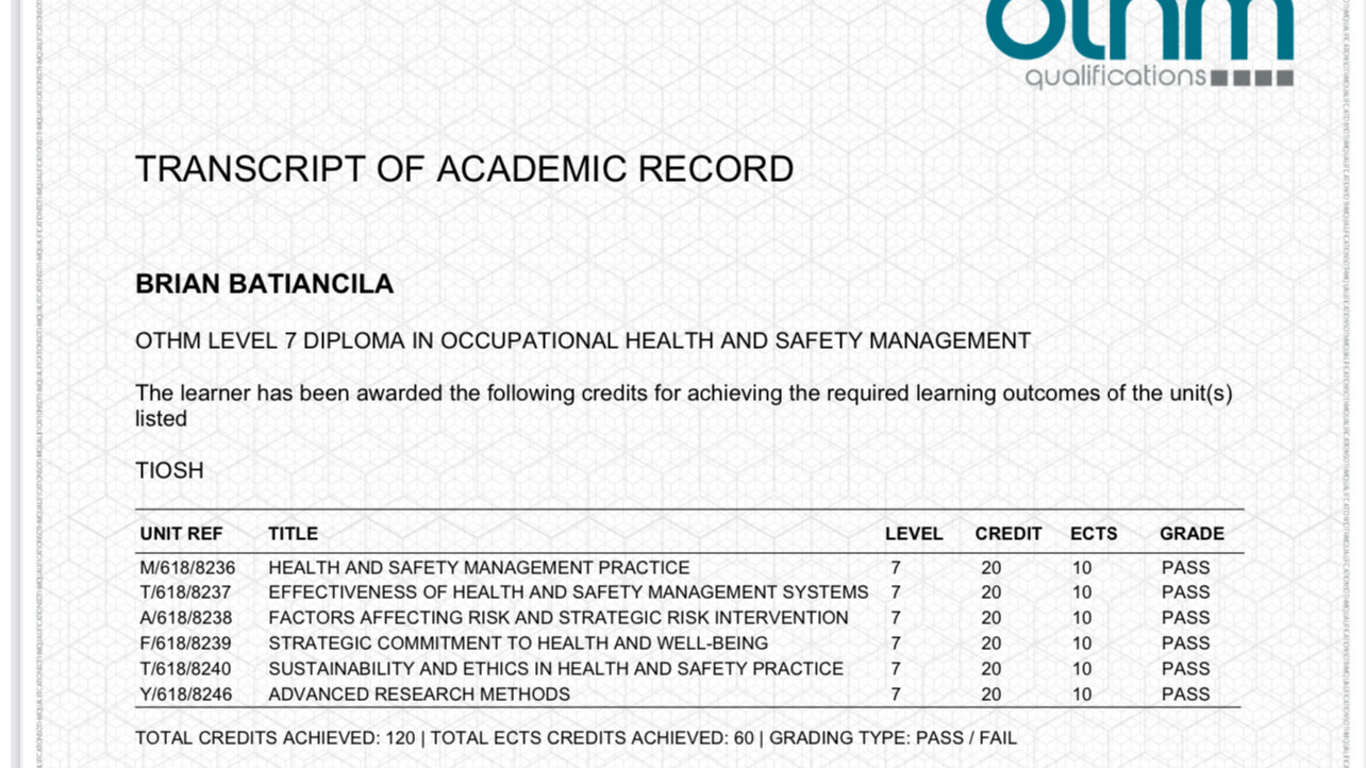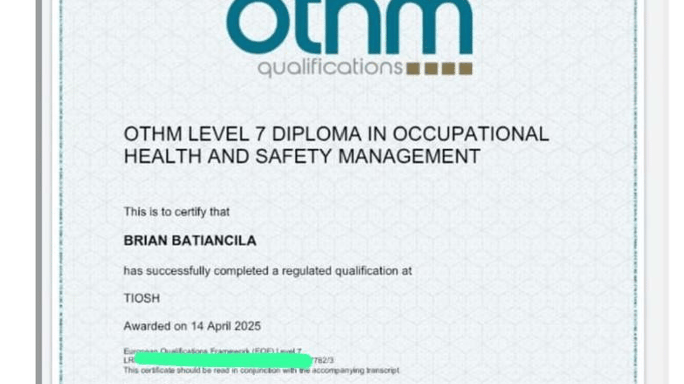 I am proud to have completed the OTHM Level 7 Diploma in Occupational Health and Safety through Bangsamoro Safety Academy in just four months. The program was intensive, well-structured, and greatly enhanced my leadership and strategic safety management skills.