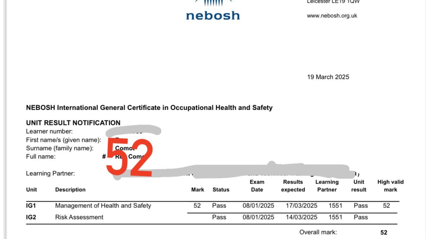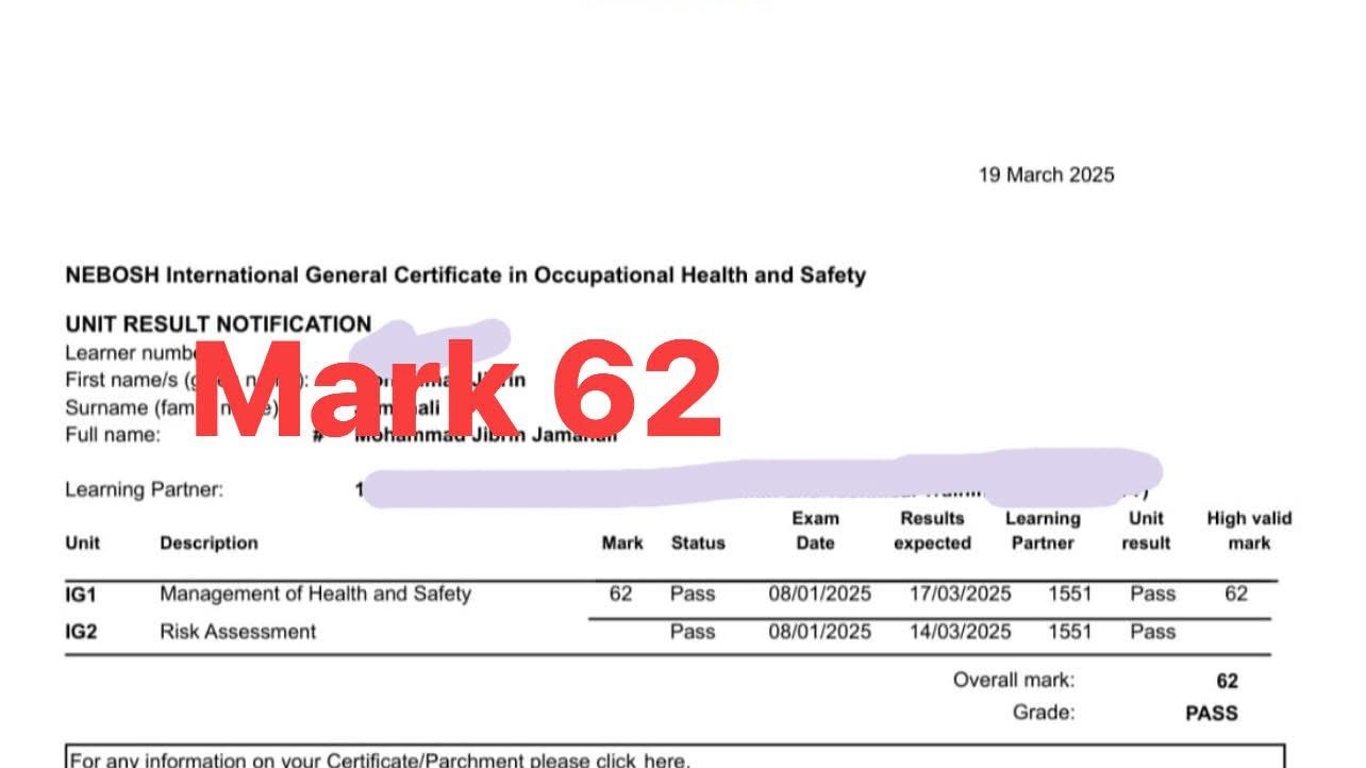 "I am incredibly proud to have completed the OSHA USA Compliance, IOSH Managing Safely, and NEBOSH IGC courses with high marks 62. These achievements have strengthened my knowledge in safety management and prepared me for a successful career in the field.