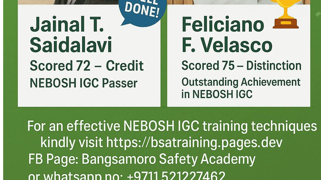 A student from Bangsamoro Safety Academy shared a proud testimonial, praising the academy’s outstanding training after passing OSHA Compliance, IOSH Managing Safely, and NEBOSH IGC on the first attempt with a high mark of 64..